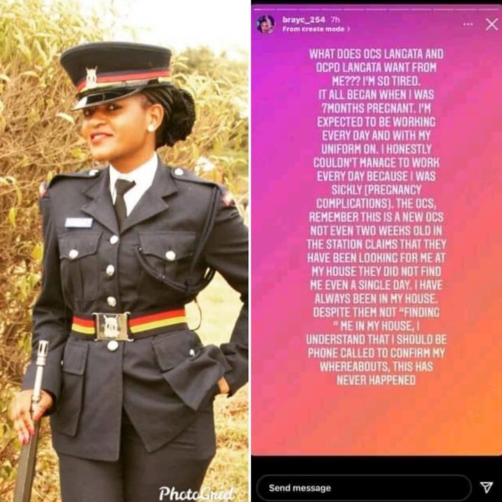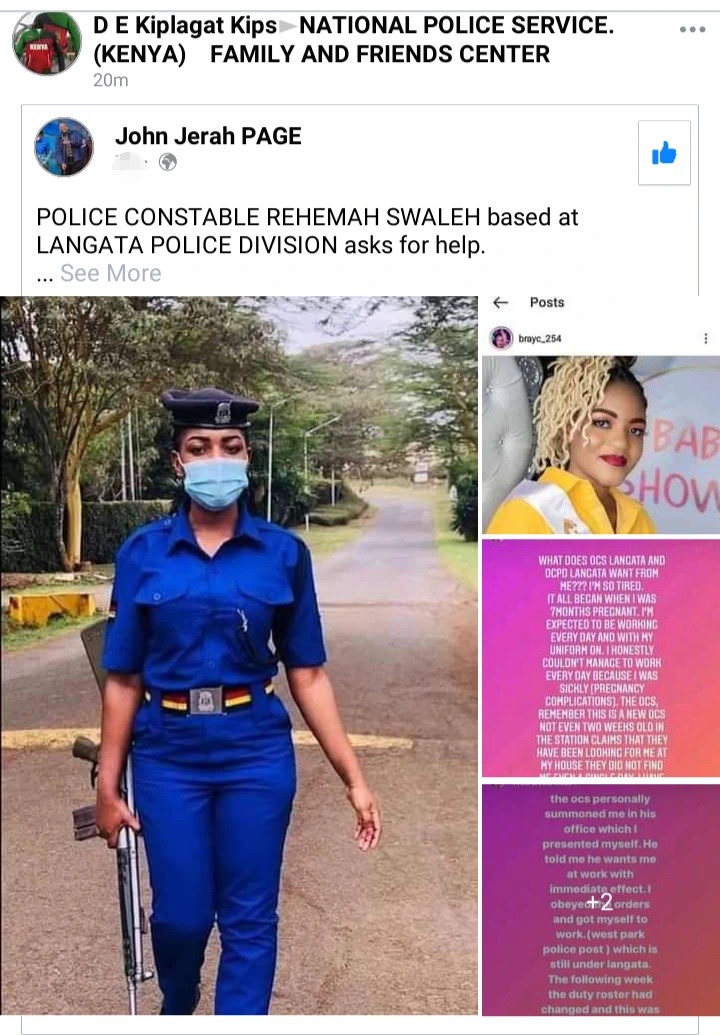 Days later, another female cop based at Langata also took to her social media account to share the same woes she has been going through at the hands of her bosses. She said that all her woes started when she was pregnant and when she asked for maternal leave she was denied. Constable Rehema Swaleh has been calling for the police service to intervene but it seems nothing is being worked on.