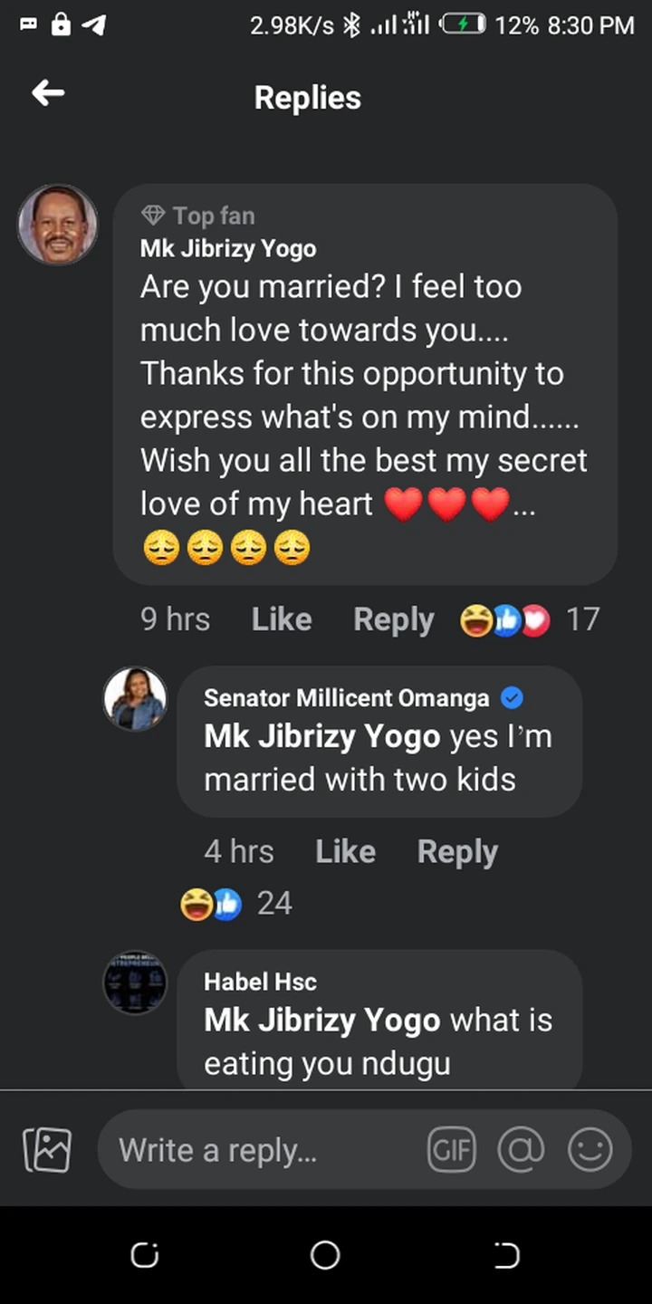 What surprised the netizens and Omanga was when one man innocently expressed his love for the legislature. Going by the name Mk Jibrizy Yogo, he asked whether Omanga was married and that he has been feeling something for her and wanted to share it out.