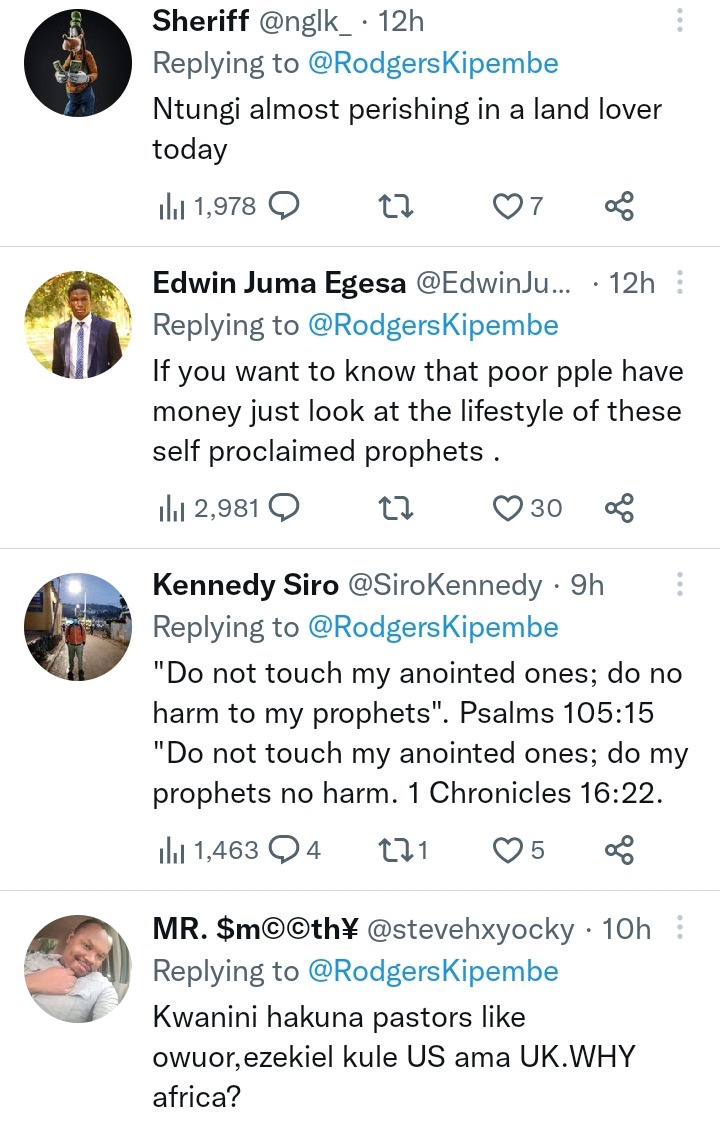 "If you want to know that poor pple have money just look at the lifestyle of these self proclaimed prophets ." Edwin Juma posted.