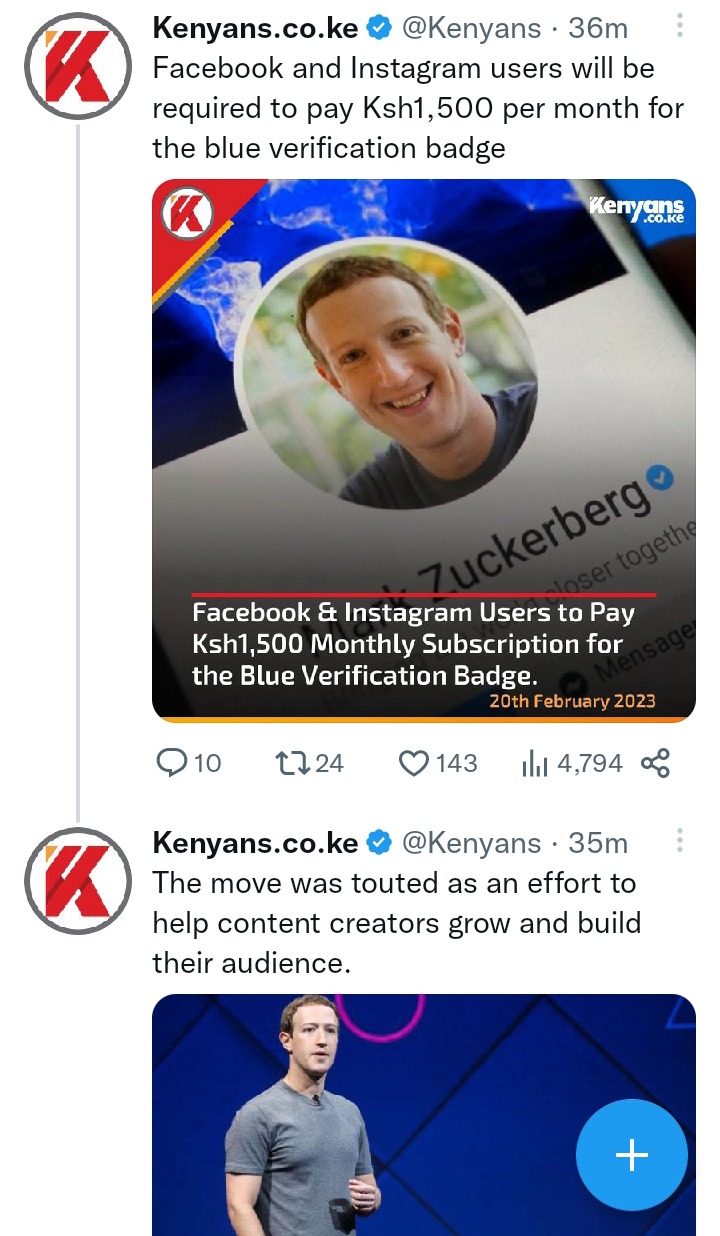 While releasing the prices, the company announced that those with Apple's iOS will pay Ksh 1,500 per month with Android users paying Ksh 1,900 perm month. This move comes barely months after Twitter CEO Elon Musk launched the blue badge subscription for it's Twitter users which is currently going at Ksh 1,400 per month.