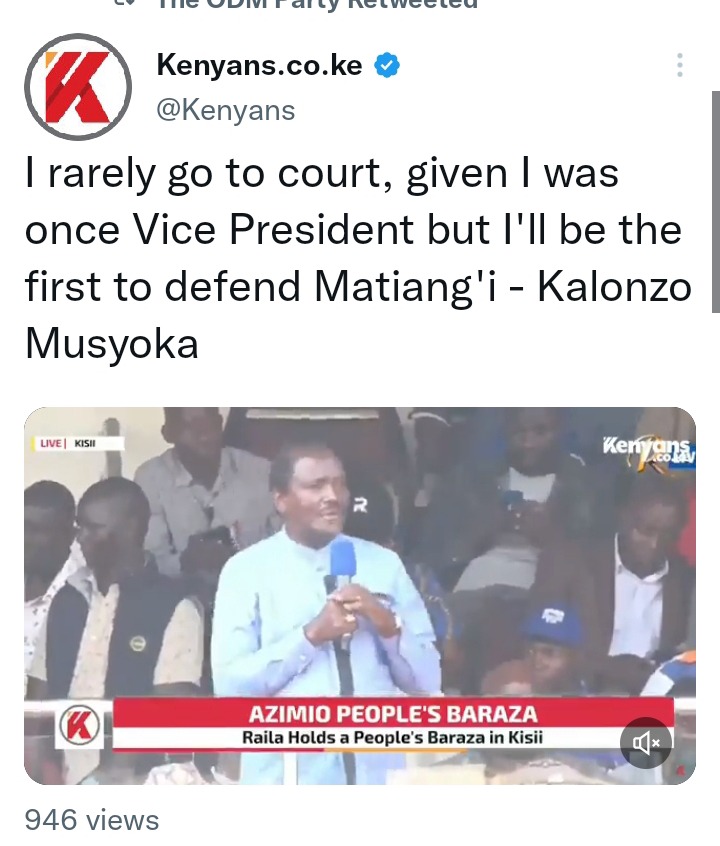 "I rarely go to court, given I was once Vice President but I'll be the first to defend Matiang'i." Kalonzo Musyoka.