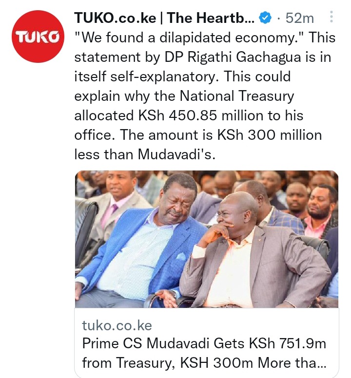 Even as that continues, the government released a supplementary budged where it's now clear that Prime Cabinet Secretary, Hon Musalia Mudavadi got a lion's share compared to the second in command. According to the news, Prime CS's office was allocated a whooping Ksh. 752.9 million to use it in running the office and oversee the tasks that were allocated to the office.
