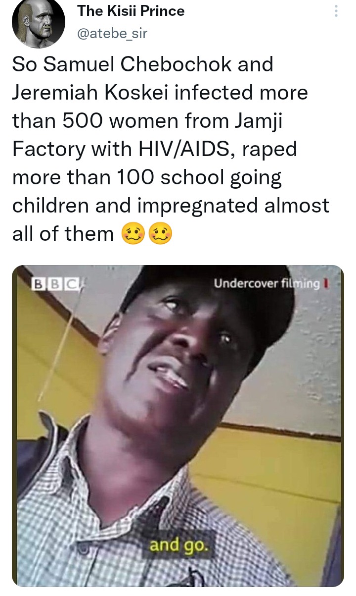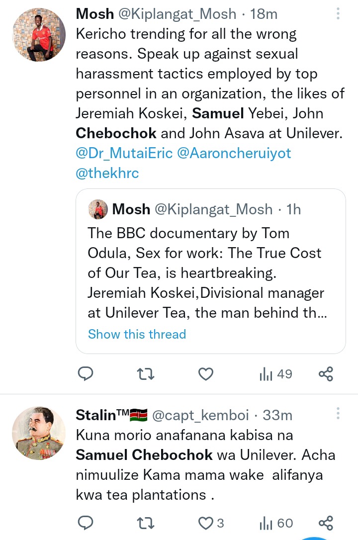 In the viral video where the victims spoke to the investigative journalist, dozens of women in Kenya revealed that they were forced into s3x with their managers while working on the tea plantations owned by two British companies.According to the revelation by the victims who talked to BBC News revealed that one Samuel Chebochok and Jeremiah Koskei have been the main culprits asking for s3xual favors before employing them.