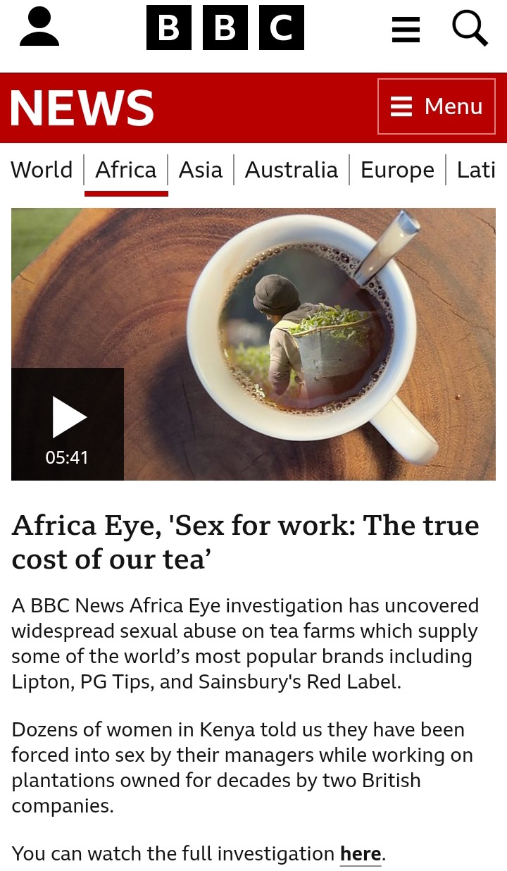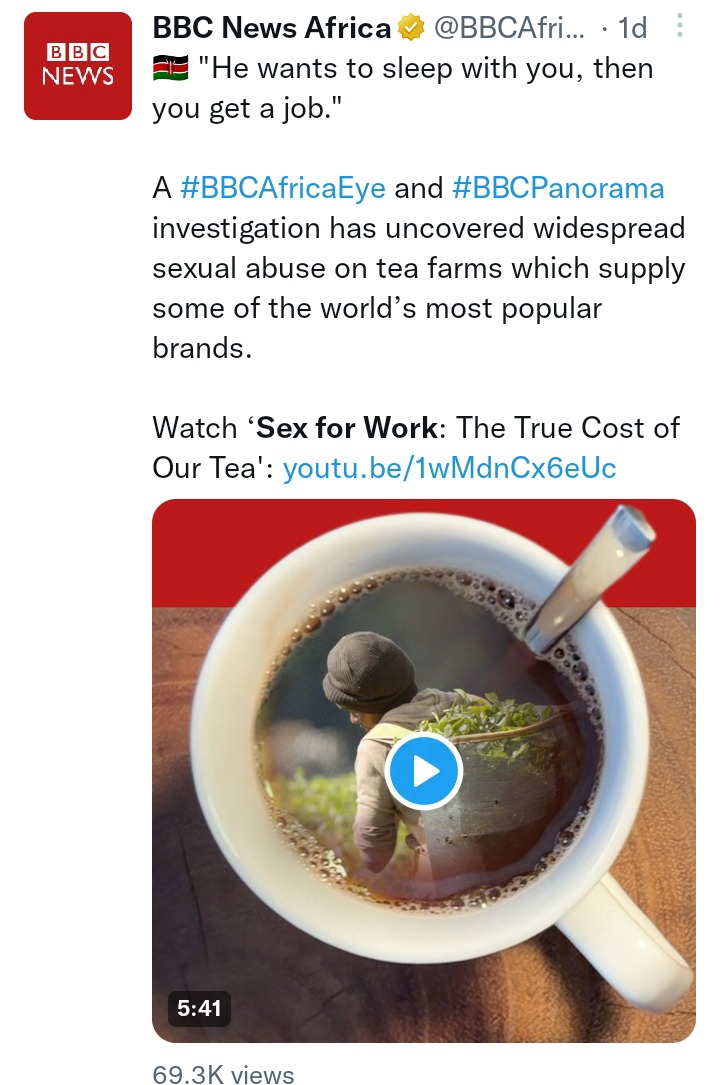 A recent expose that was conducted by BBC News Africa Eye investigation has uncovered widespread s3xual abuse on tea farms which supply some of the world’s most popular brands including Lipton, PG Tips, and Sainsbury's Red Label.
