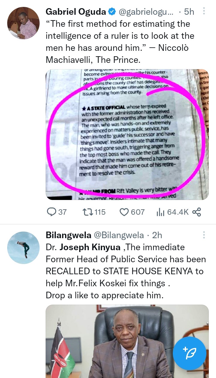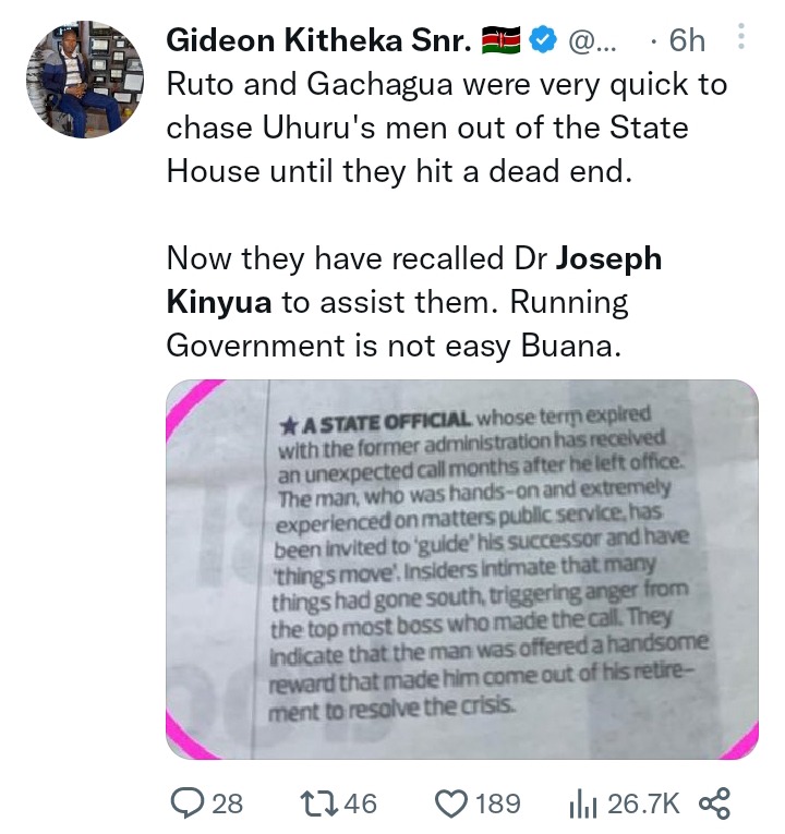 "Ruto and Gachagua were very quick to chase Uhuru's men out of the State House until they hit a dead end. Now they have recalled Dr Joseph Kinyua to assist them. Running Government is not easy Buana." Gideon Kitheka.