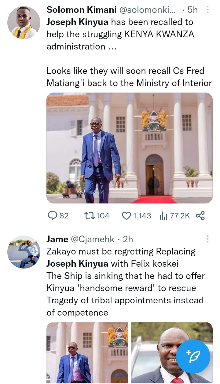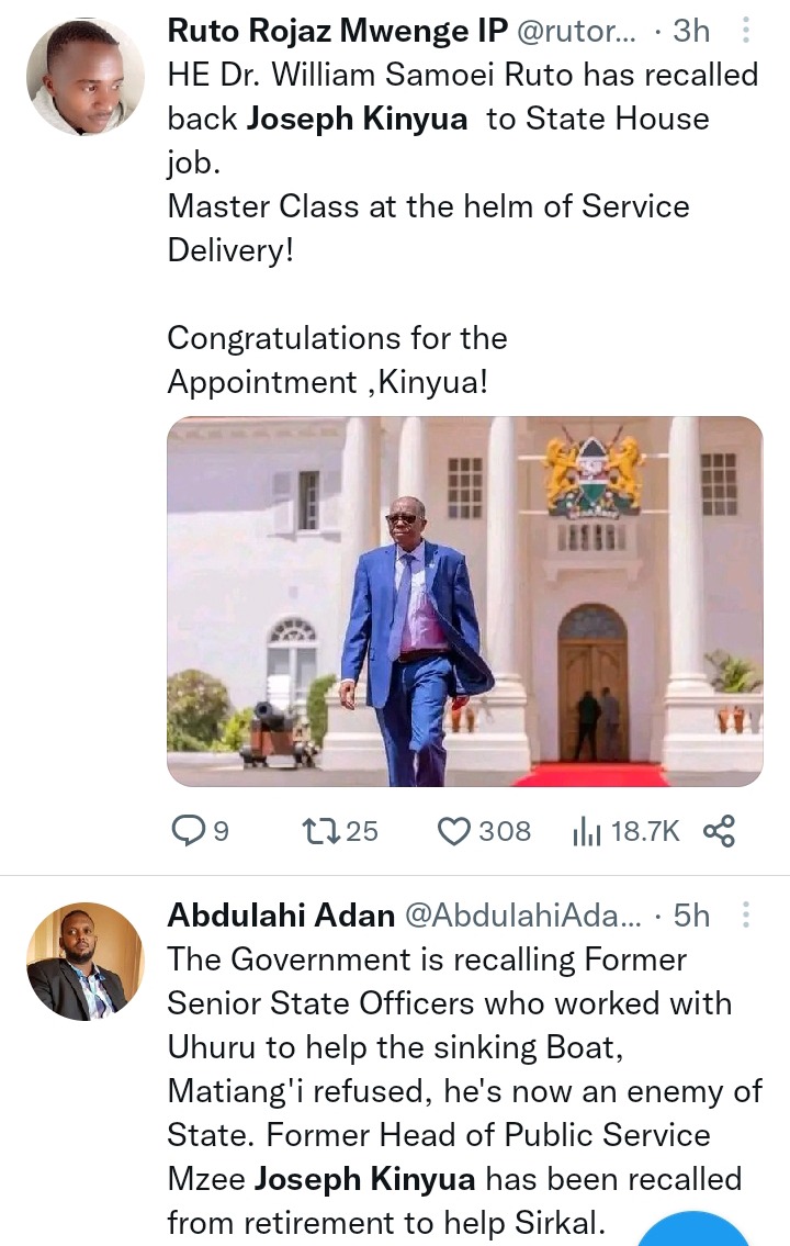 "The Government is recalling Former Senior State Officers who worked with Uhuru to help the sinking Boat, Matiang'i refused, he's now an enemy of State. Former Head of Public Service Mzee Joseph Kinyua has been recalled from retirement to help Sirkal." Abdulahi Adan.