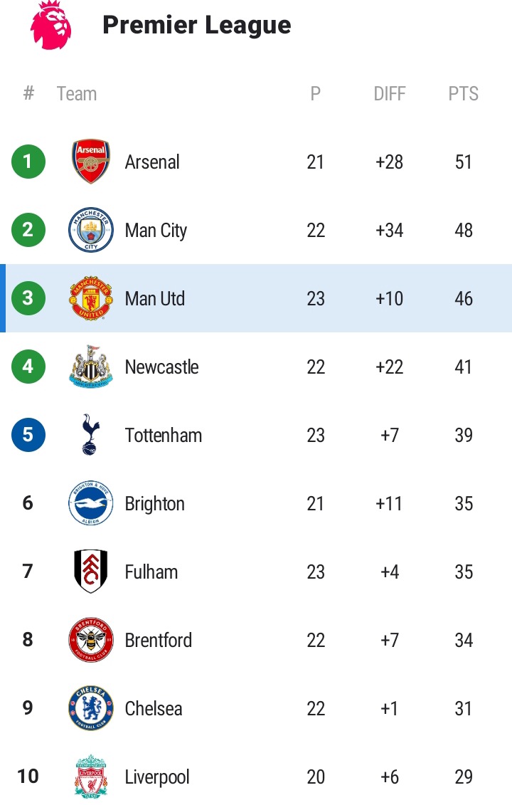 Following those performances, the gap between first placed Arsenal and second placed Man City has reduced to three points from 9 points just a week ago. United are also closing in with only five points different between them and league leaders Arsenal. Newcastle United comes fourth with Tottenham Hotspur finishing the top five spot.