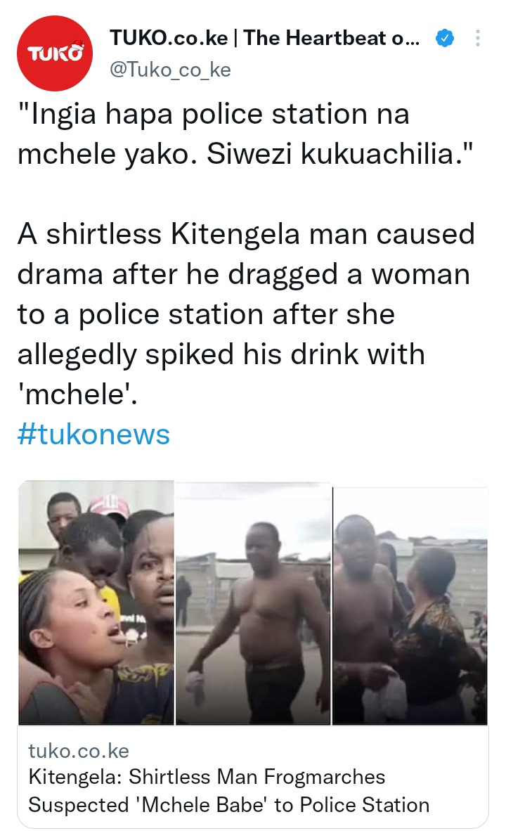 There was a lot of drama in the streets of Kitengela town after an angry shirtless man frogmarched a woman on the suspicion of spiking his drink in a bar. The man who looked furious and with anger was seen dragging the 'muchele babe' to the Kitengela police station.