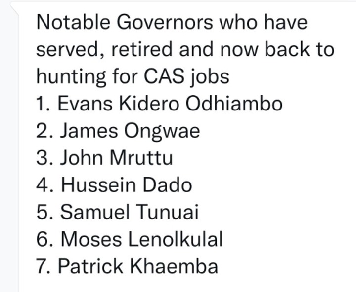 What however shocked many Kenyans was to see former Governors also lining up for appointment even after some serving their two terms as county bosses. Some notable names of ex governors that were in the shortlist include former Nairobi County boss Evans Kidero, former Kisii County Governor James Ongwae, Former Governor Taita Taveta John Muruttu, former Narok governor Samuel Tunai, formed governor Tana River Hussain Dado, former Samburu county governor Moses Lenolkulal, and former Trans-Zoia boss Patrick Khahemba.