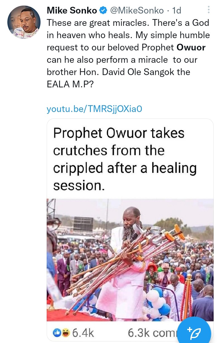 This however sparked some reactions online with the former Nairobi boss Mike Sonko who asked the prophet to do the same healing on EALA MP Hon David Ole Sankok.
