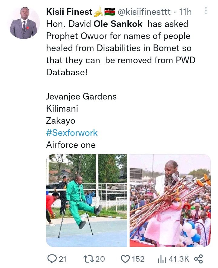 Today, Ole Sankok has finally broken his silence where he said that if indeed there was healing as alleged by the Owuor ministry, then he should supply them with names of those healed so that they can remove them from their disability database.