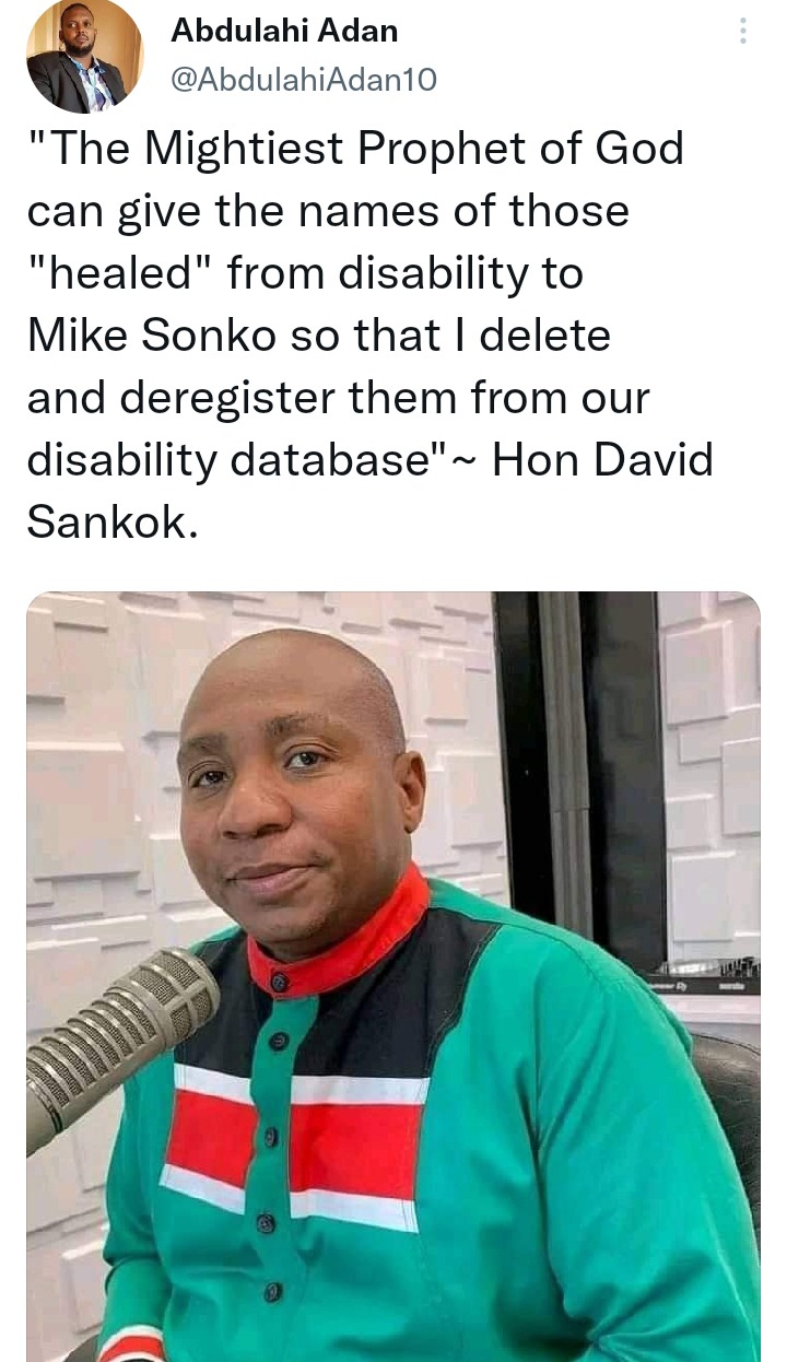 "The Mightiest Prophet of God can give the names of those "healed" from disability to Mike Sonko so that I delete and deregister them from our disability database"~ Hon David Sankok.