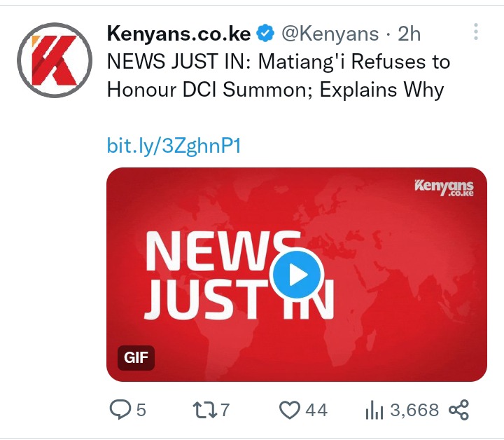 Director of Criminal Investigations (DCI) Amin Mohamed was yet to issue a statement on Lawyer Omari's response to the summons and what other step they will take after Matiangi failed to appear before them.