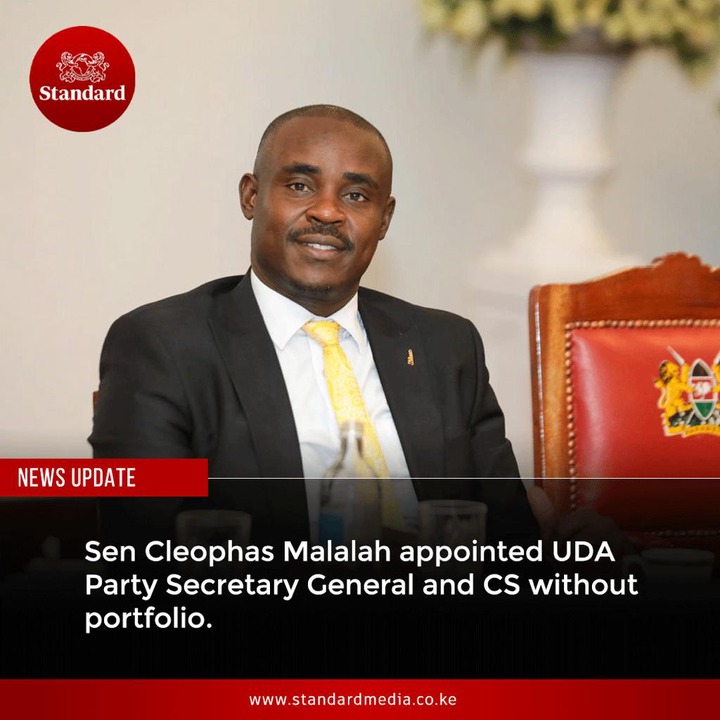 Reports reaching news desks has revealed that Cleophas Malala has been appointed as the United Democratic Alliance (UDA) secretary General and also a Cabinet Secretary without any portfolio. Malala takes over from Veronica Maina who was appointed to the Senate.