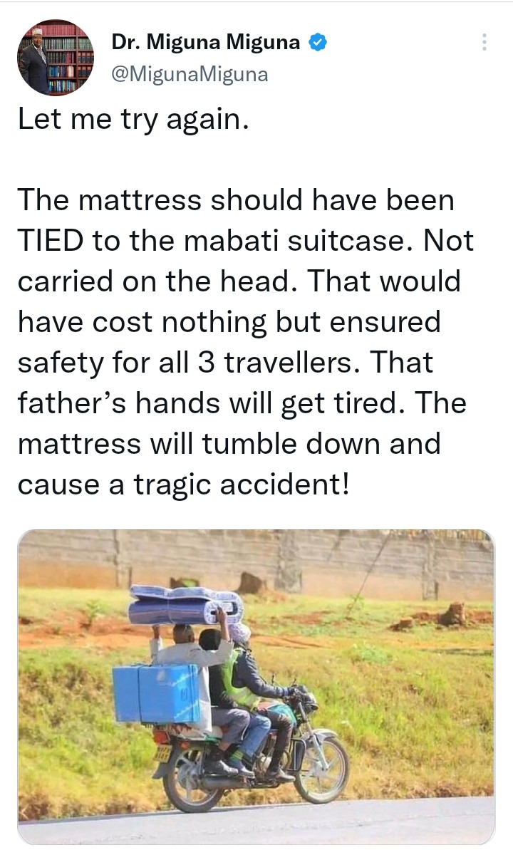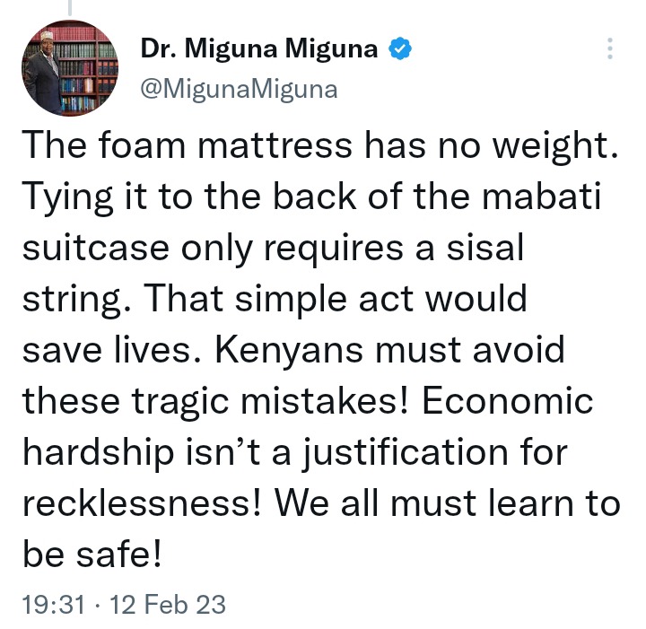 "The foam mattress has no weight. Tying it to the back of the mabati suitcase only requires a sisal string. That simple act would save lives. Kenyans must avoid these tragic mistakes! Economic hardship isn’t a justification for recklessness! We all must learn to be safe!" Added Miguna.